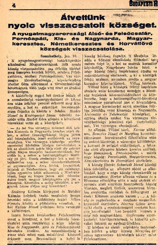 Az ősi Vas vármegye örömmel öleli keblére Kisnarda és Nagynarda hazafia népét akkor, a mikor