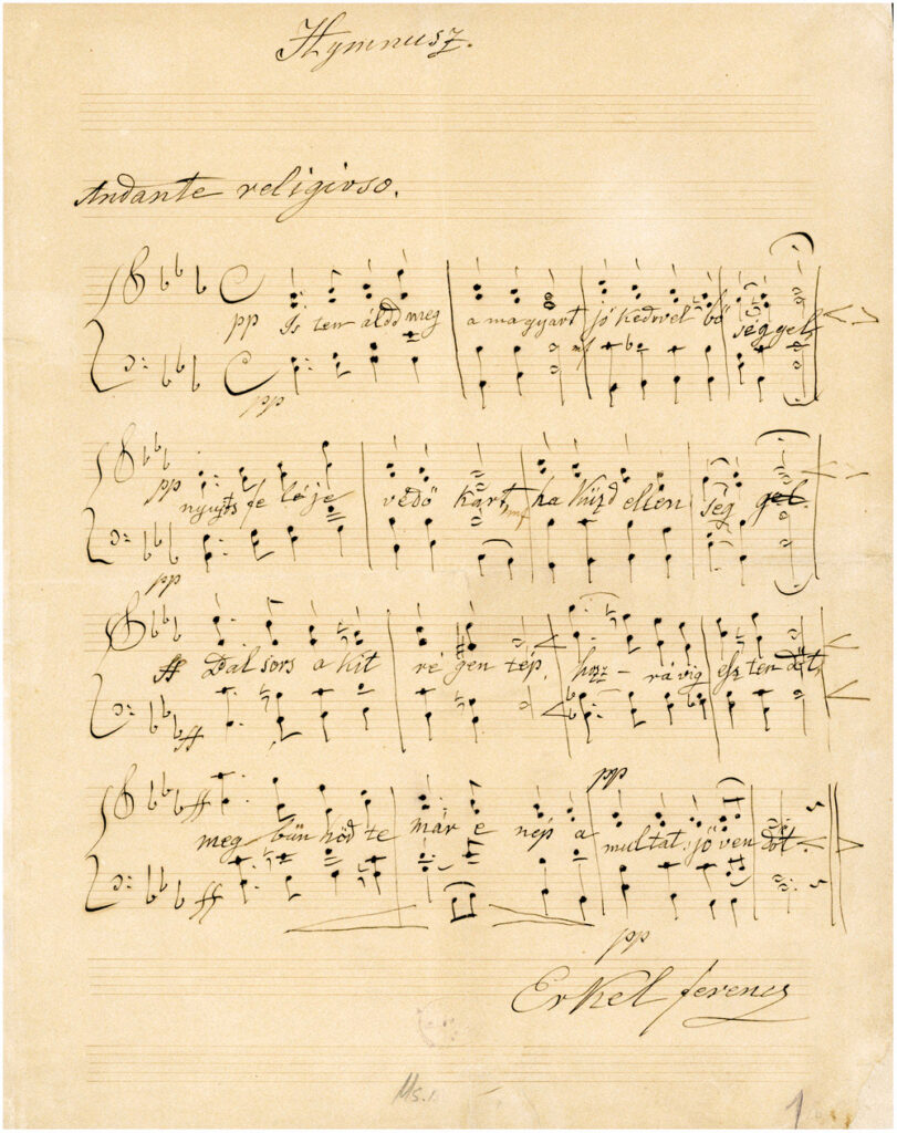 Ekkorra Erkel Ferenc már meg is írta a Himnusz zenéjét, amelyet be is nyújtott a Nemzeti Színházhoz. Közismert, hogy a magyar zenei nyelv megújítására törekvő zeneszerzőkéziratát „Itt az Írás, forgassátok / Érett ésszel, józanon. Kölcsey” jeligével küldte be, és „Deák Ferencz úrnak tisztelettel” ajánlotta.
